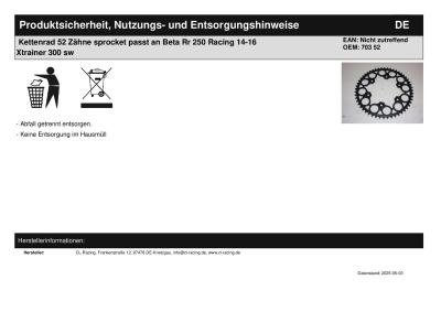 Titel: | Kettenrad 52 Zähne sprocket passt an Beta Rr 250 Racing 14-16 Xtrainer 300 sw |