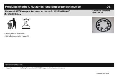 Titel: | Kettenrad 52 Zähne sprocket passt an Honda Cr 125 250 R 89-07 Crf 450 02-20 sw |