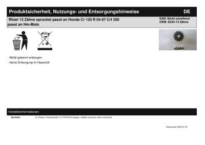 Titel: | Ritzel 13 Zähne sprocket passt an Honda Cr 125 R 04-07 Crf 250 passt an Hm-Moto |