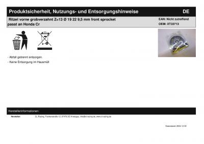 Titel: | Ritzel vorne grobverzahnt Z=13 Ø 19 22 9,5 mm front sprocket passt an Honda Cr |