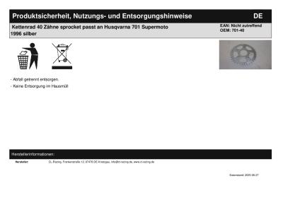 | Titel: | Kettenrad 40 Zähne sprocket passt an Husqvarna 701 Supermoto 1996 silber |