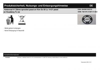 Titel: | Kettenrad 41 Zähne sprocket passt an Ktm Sx 50 Lc 14-21 passt an Husaberg Tc sw |