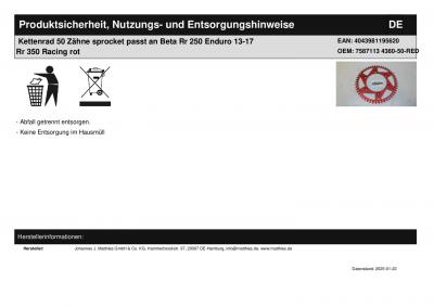 Titel: | Kettenrad 50 Zähne sprocket passt an Beta Rr 250 Enduro 13-17 Rr 350 Racing rot |