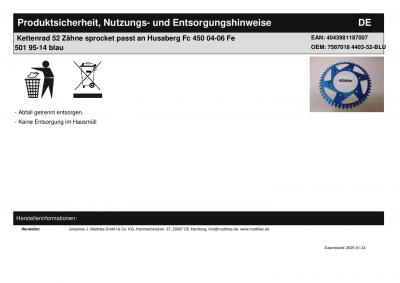 Titel: | Kettenrad 52 Zähne sprocket passt an Husaberg Fc 450 04-06 Fe 501 95-14 blau |