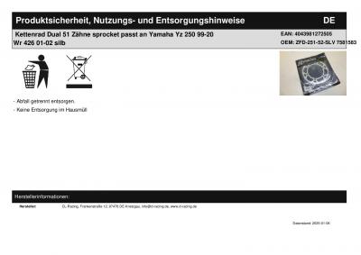 | Titel: | Kettenrad Dual 51 Zähne sprocket passt an Yamaha Yz 250 99-20 Wr 426 01-02 silb |