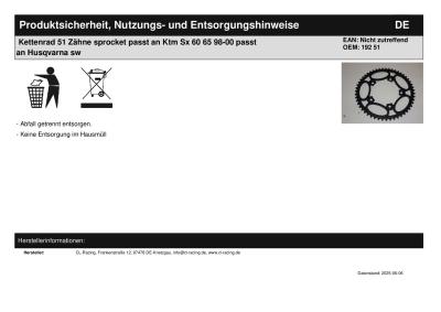 Titel: | Kettenrad 51 Zähne sprocket passt an Ktm Sx 60 65 98-00 passt an Husqvarna sw |