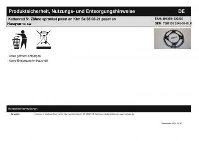 Titel: | Kettenrad 51 Zähne sprocket passt an Ktm Sx 85 03-21 passt an Husqvarna sw |