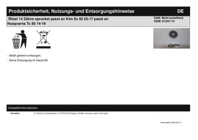 Titel: | Ritzel 14 Zähne sprocket passt an Ktm Sx 85 03-17 passt an Husqvarna Tc 85 14-19 |