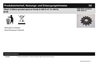 | Titel: | Ritzel 13 Zähne sprocket passt an Honda Xr 600 91-01 Trx 400 Ex 05-08 |