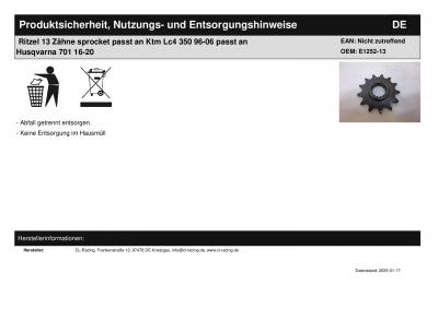Titel: | Ritzel 13 Zähne sprocket passt an Ktm Lc4 350 96-06 passt an Husqvarna 701 16-20 |