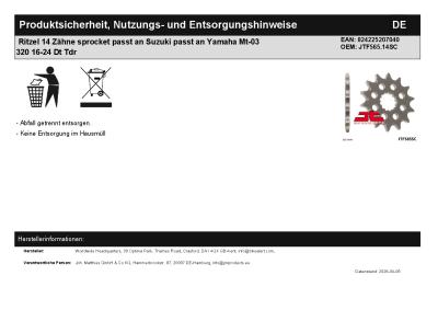 | Titel: | Ritzel 14 Zähne sprocket passt an Suzuki passt an Yamaha Mt-03 320 16-24 Dt Tdr |