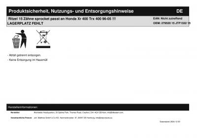 | Titel: | Ritzel 15 Zähne sprocket passt an Honda Xr 400 Trx 400 96-05 |