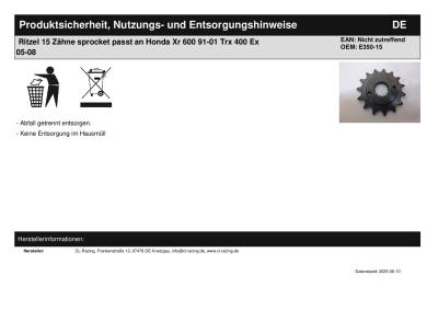 | Titel: | Ritzel 15 Zähne sprocket passt an Honda Xr 600 91-01 Trx 400 Ex 05-08 |