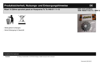 | Titel: | Ritzel 15 Zähne sprocket passt an Husqvarna Tc Te 449-511 11-13 |