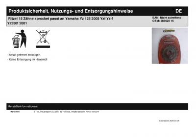 | Titel: | Ritzel 15 Zähne sprocket passt an Yamaha Yz 125 2005 Yzf Yz-f Yz250f 2001 |