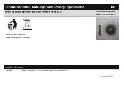 | Titel: | Ritzel 15 Zähne sprocket passt an Yamaha Yz 85 02-24 |