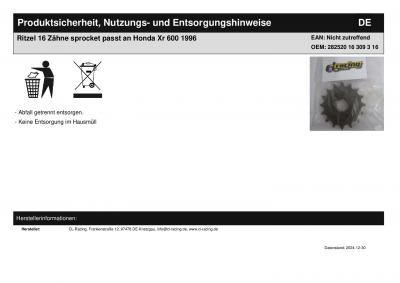 | Titel: | Ritzel 16 Zähne sprocket passt an Honda Xr 600 1996 |