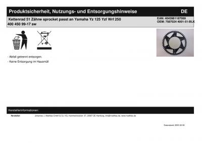 Titel: | Kettenrad 51 Zähne sprocket passt an Yamaha Yz 125 Yzf Wrf 250 400 450 99-17 sw |