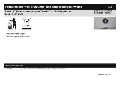 Titel: | Ritzel 13 Zähne sprocket passt an Yamaha Yz 125 87-04 passt an Ktm Lc2 125 96-00 |