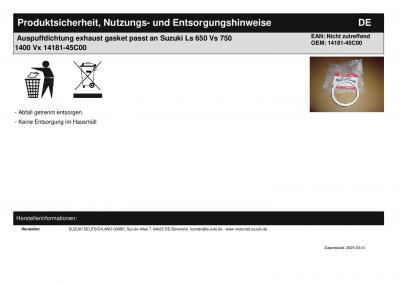 Auspuffdichtung exhaust gasket passt an Suzuki Ls 650 Vs 750 1400 Vx 14181-45C00