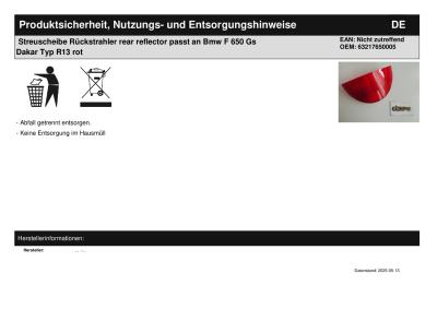 | Titel: | Streuscheibe Rückstrahler rear reflector passt an Bmw F 650 Gs Dakar Typ R13 rot |