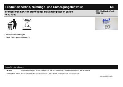 Titel: | Bremsbacken EBC 601 Bremsbeläge brake pads passt an Suzuki Fz 50 79-83 |