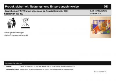 Titel: | Bremsbeläge FA47R brake pads passt an Polaris Scrambler 850 Sportsman 325 400 |