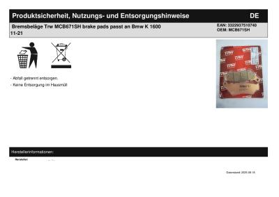 Titel: | Bremsbeläge Trw MCB671SH brake pads passt an Bmw K 1600 11-21 |