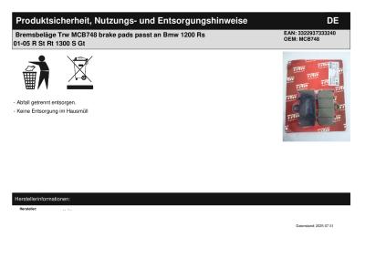 Titel: | Bremsbeläge Trw MCB748 brake pads passt an Bmw 1200 Rs 01-05 R St Rt 1300 S Gt |