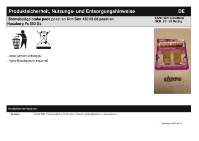 Titel: | Bremsbeläge brake pads passt an Ktm Smr 450 05-06 passt an Husaberg Fs 550 Gs |