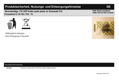 Titel: | Bremsbeläge FA135R brake pads passt an Kawasaki Klx Crossland Cr Dr Rm Yfm Yz |