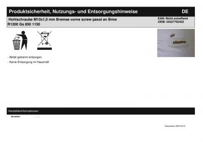 Titel: | Hohlschraube M10x1,0 mm Bremse vorne screw passt an Bmw R1200 Gs 850 1150 |