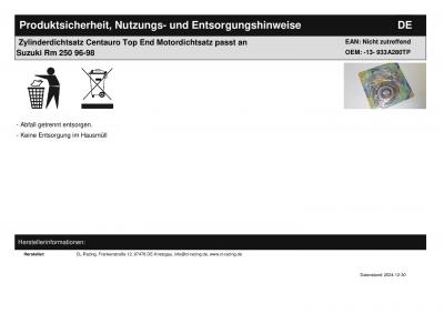 Titel: | Zylinderdichtsatz Centauro Top End Motordichtsatz passt an Suzuki Rm 250 96-98 |