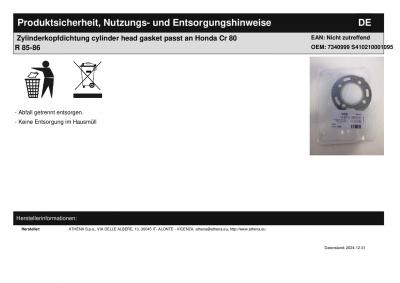 Zylinderkopfdichtung cylinder head gasket passt an Honda Cr 80 R 85-86
