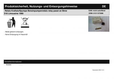 Titel: | Relais Kraftstoffpumpe Benzinpumpenrelais relay passt an Bmw 518 Limousine 1980 |