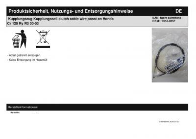 Titel: | Kupplungszug Kupplungsseil clutch cable wire passt an Honda Cr 125 Ry R3 00-03 |