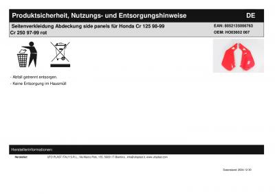 Titel: | Seitenverkleidung Abdeckung side panels passt an Honda Cr 125 98-99 Cr 250 97-99 rot |