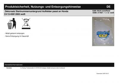 Dekorsatz Startnummernuntergrund Aufkleber passt an Honda Crf Cr450f 2002 weiß