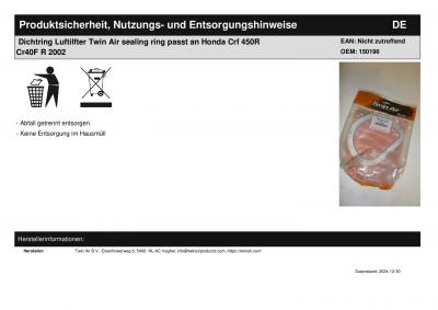 Titel: | Dichtring Luftilfter Twin Air sealing ring passt an Honda Crf 450R Cr40F R 2002 |