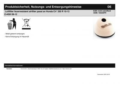 Titel: | Luftfilter feuerresistent airfilter passt an Honda Crf 250 R 10-13 Cr450f 09-12 |
