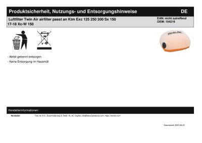 Titel: | Luftfilter Twin Air airfilter passt an Ktm Exc 125 250 300 Sx 150 17-18 Xc-W 150 |
