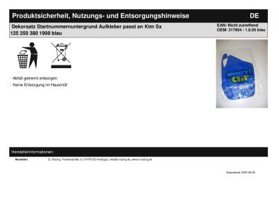 Titel: | Dekorsatz Startnummernuntergrund Aufkleber passt an Ktm Sx 125 250 380 1998 blau |