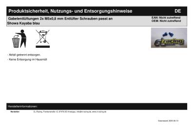 Titel: | Gabelentlüftungen 2x M5x0,8 mm Entlüfter Schrauben passt an Showa Kayaba blau |