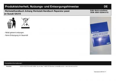 Werkstatthandbuch Anhang Werkstatt-Handbuch Reparatur passt an Suzuki SA310