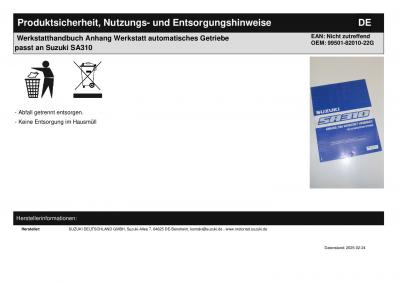 Werkstatthandbuch Anhang Werkstatt automatisches Getriebe passt an Suzuki SA310