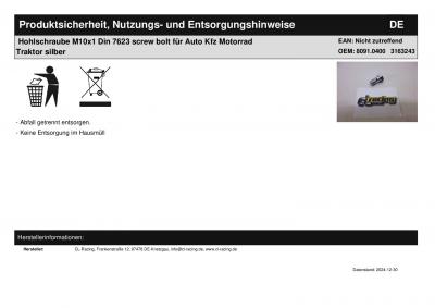 Hohlschraube M10x1 Din 7623 screw bolt für Auto Kfz Motorrad Traktor silber