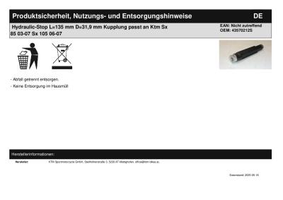 Titel: | Hydraulic-Stop L=135 mm D=31,9 mm Kupplung passt an Ktm Sx 85 03-07 Sx 105 06-07 |