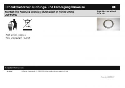 Stahlscheibe Kupplung steel plate clutch passt an Honda Crf 250 Cr250f 2006