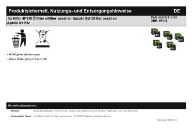 | Titel: | 5x Hiflo HF138 Ölfilter oilfilter passt an Suzuki Gsf Dl Gsr passt an Aprilia Rs Klv |