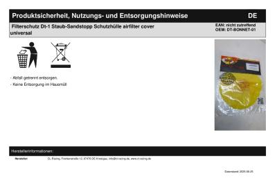 Titel: | Filterschutz Dt-1 Staub-Sandstopp Schutzhülle airfilter cover universal |